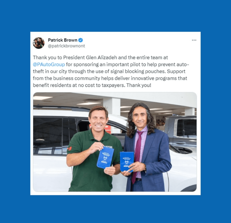 Mayor of Brampton, Patrick Brown thanks “President Glen Alizadeh and the entire team at Performance Auto Group for sponsoring an important pilot to help prevent auto theft in our city”. He goes on to say “Support from the business community helps deliver innovative programs that benefit residents at no cost to taxpayers. Thank you”.